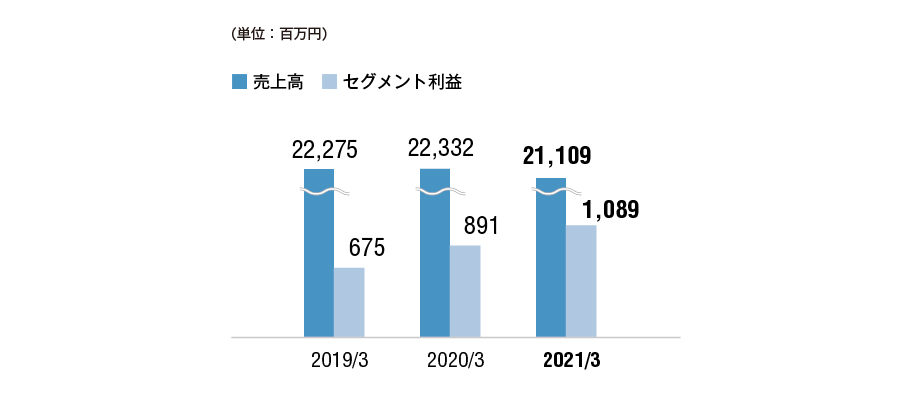 室内装飾関連事業においては、ビニールカーテンやクリアロールスクリーン等を中心に非住宅市場や飛沫対策の需要獲得に努めましたが、新型コロナウイルス感染症拡大防止のため展示会等のイベントの中止や従来の営業活動自粛等により、売上高は21,109百万円(前期比5.5%減少)となりました。セグメント利益については、展示会の中止による販売促進費の抑制や原価低減活動、生産性向上の推進に努めた結果、1,089百万円(同22.3%増加)となりました。