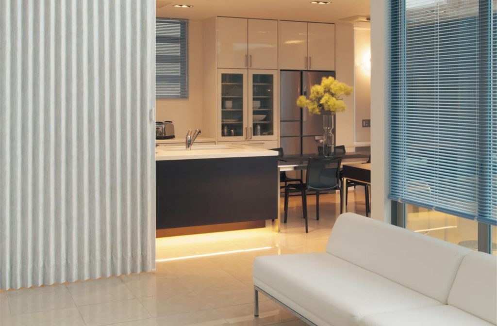操作方法は、端に取り付けられたバトンやコードを操作し、カーテンのように開閉します。またスラット(ルーバー)の角度を調整すれば、採光の具合やプライバシーの確保が簡単に行えるので、多彩な開閉バリエーションが楽しめます。