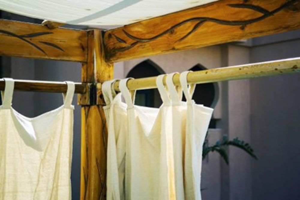 設置幅よりやや大きめのサイズを選び、突っ張り棒に通す。 |