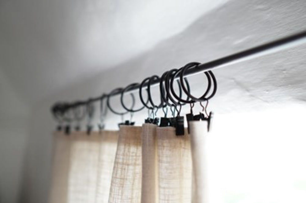 一般的なカーテンを使いたい場合は、カーテンクリップがおすすめです。カーテンクリップはカーテン上部をクリップで挟み、リングを突っ張り棒に通すだけで設置できます。取り付けたい生地にフック穴がなくても吊るせるので、一から棒を通す穴を作る必要がありません。
