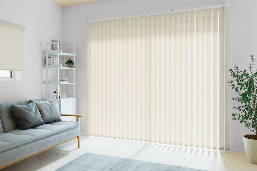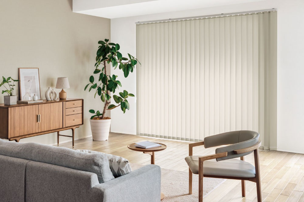 バーチカルブラインド(縦型ブラインド)は縦のラインが強調されるため、縦長リビングの天井を高く見せる効果があり、開放感のある空間になります。羽根(ルーバー)の角度を調整すれば、光の入り方や外からの視線を細かくコントロールできます。