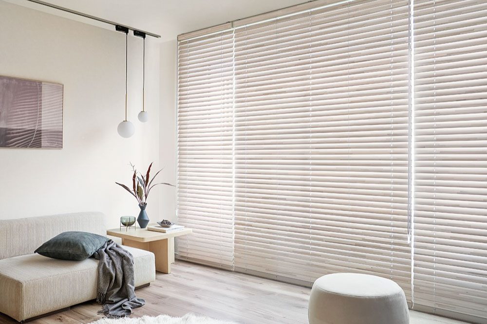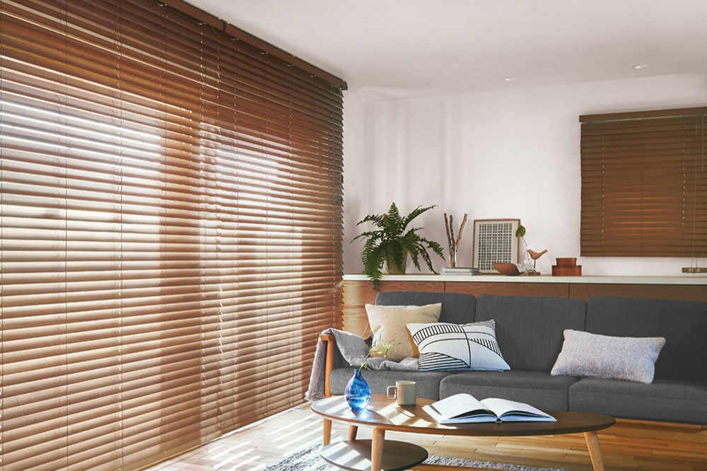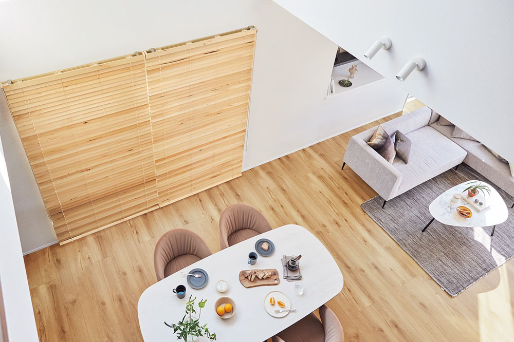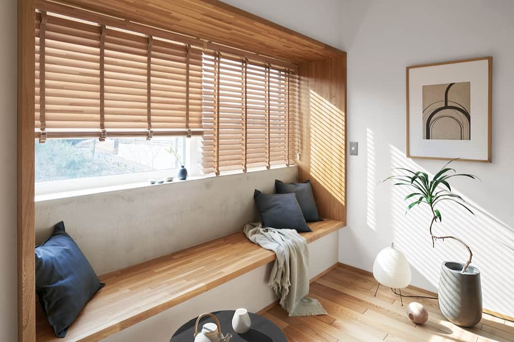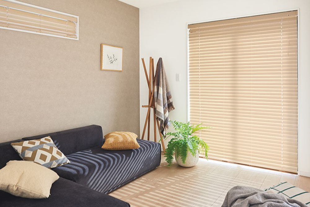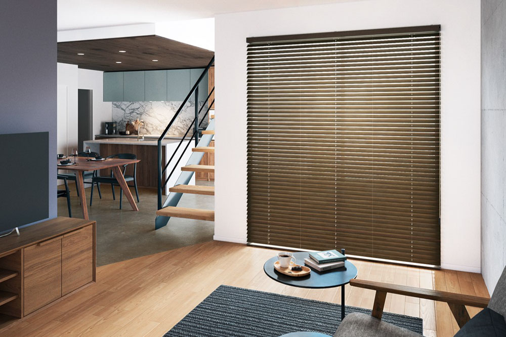 天然木や木目調の素材が、部屋に自然な温かみと上質さをもたらすウッドブラインド。重厚感があり、特に16畳や18畳といった広めのリビングに適しています。