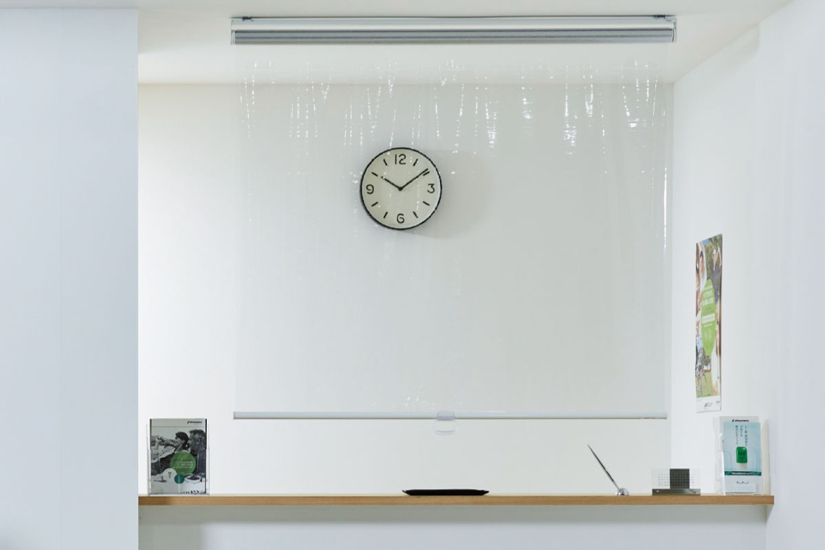 視線を確保したまま空間を間仕切れる透明タイプのロールスクリーンです。使わないときは上に巻き上げて収納でき、間仕切りだけでなく冷暖房の効率アップにも役立ちます。