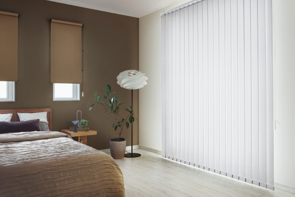 縦型のルーバー(羽根)が並ぶバーチカルブラインドは、大きな窓や掃き出し窓に映えるスタイリッシュなデザインが魅力で、天井を高く見せる効果があります。
