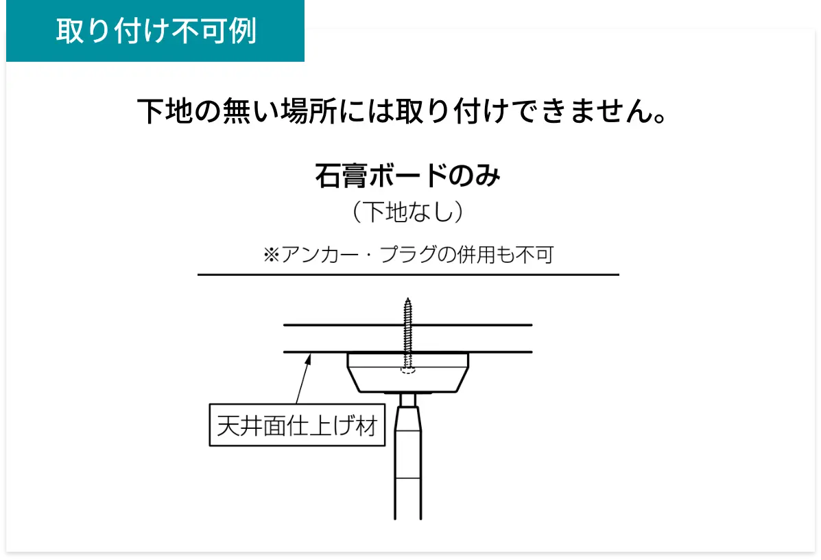 天井下地の位置と材質が分かれば、ブラケットをビス止めするだけで簡単に取り付けられます。