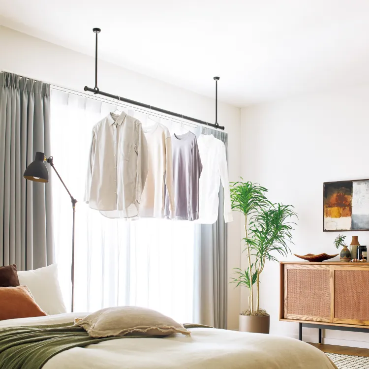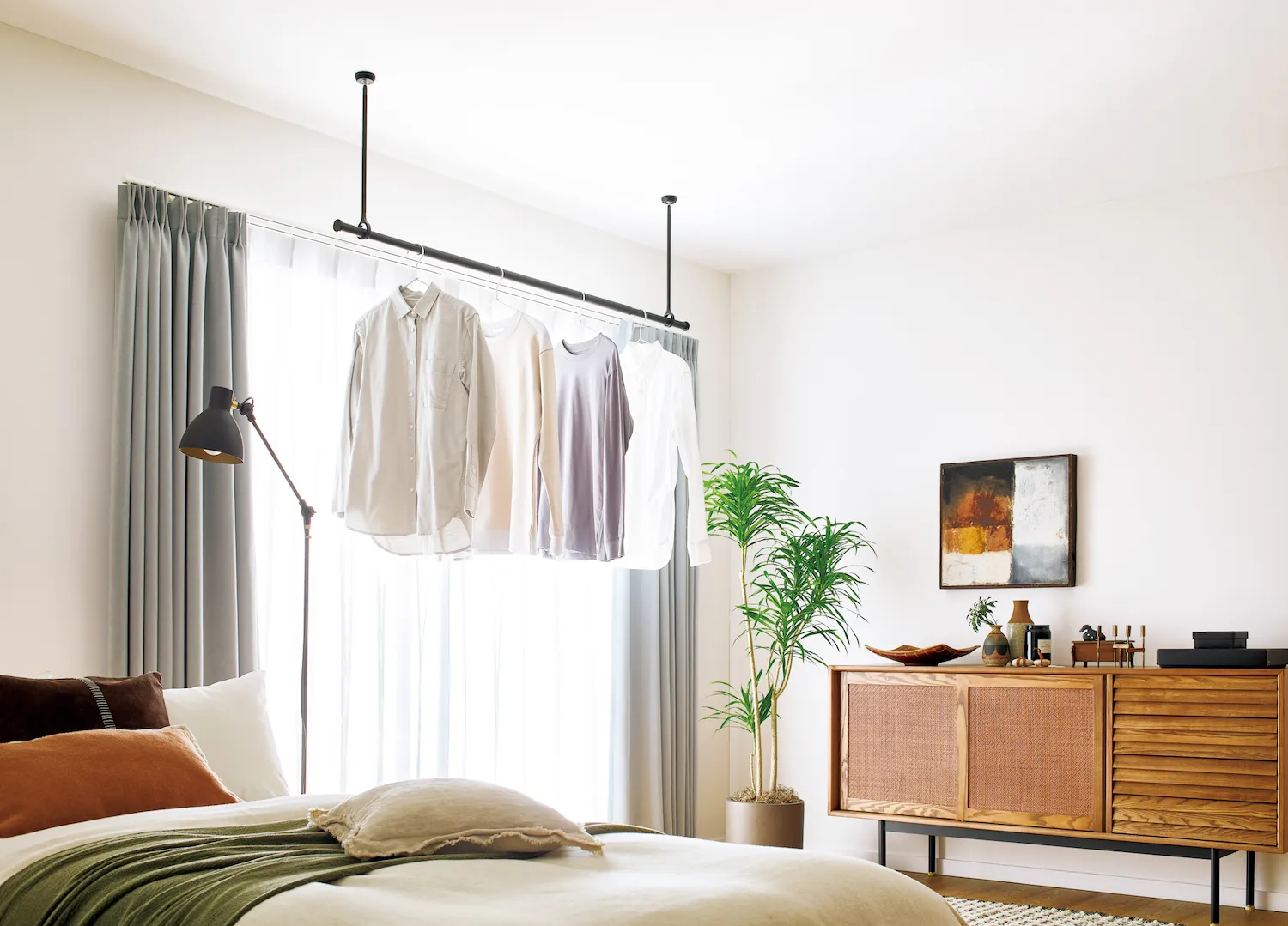 窓から450~600mmほど離して設置すると、ハンガーに掛けた服がカーテンに干渉しません。