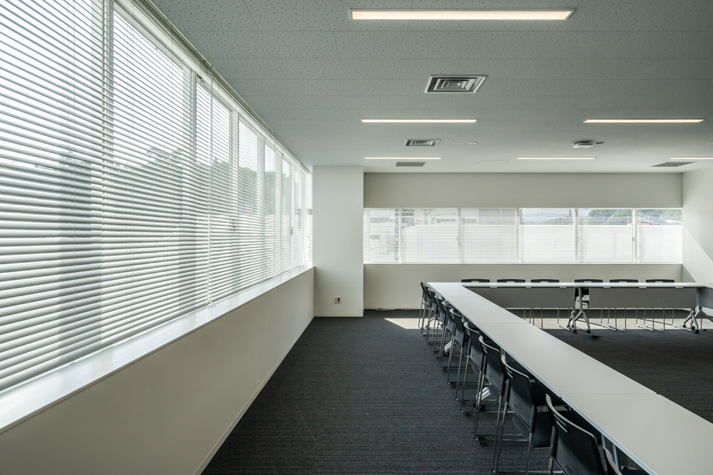 会議室の窓全面に、アルミブラインドを収めています。スペーシィタッチは手動タイプですが、降ろす際にはブラインドが自動で降下するので、このような複数台ある部屋でも煩わしさがありません。電動タイプに比べてコストを抑えることもできます。