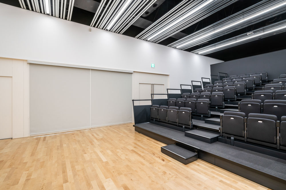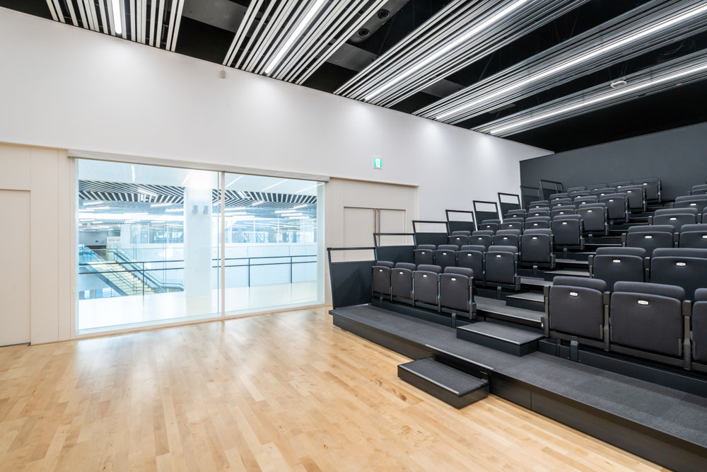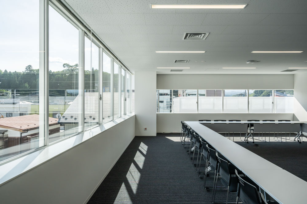 通路と多目的ホールをしきるガラス面に、ロールスクリーンを収めています。アルミブラインドと異なり、室内を目隠ししたいときはスクリーンを下まで降ろすことで遮蔽できます。逆に内部を見せたいときにはスクリーンをあげることで様子を公開でき、使い分けのできる施工になっています。