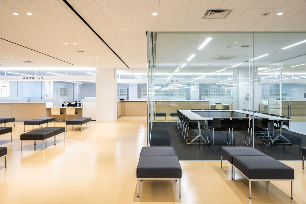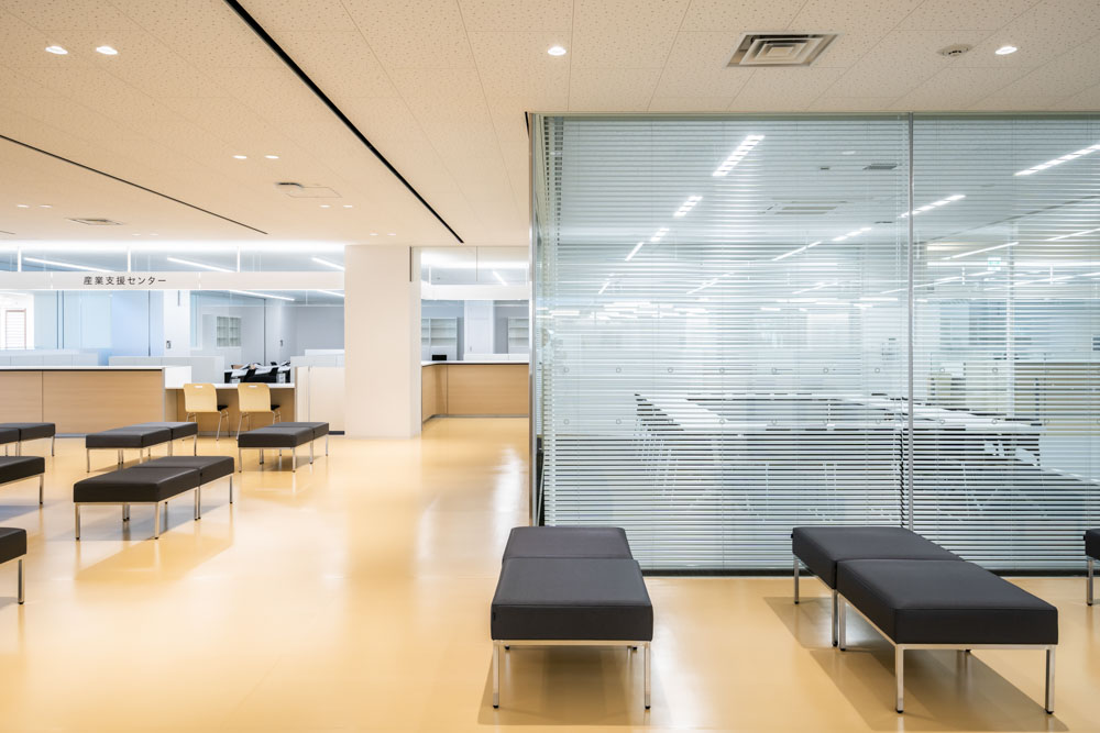 宮古市の本庁舎の窓口エリアに、横型のアルミブラインドを施工した事例です。庁舎のほとんどの部分を同じブラインドで収めています。アルミブラインドは、遮光、遮熱など、機能性にすぐれ、またカラーも豊富なバリエーションから選べます。