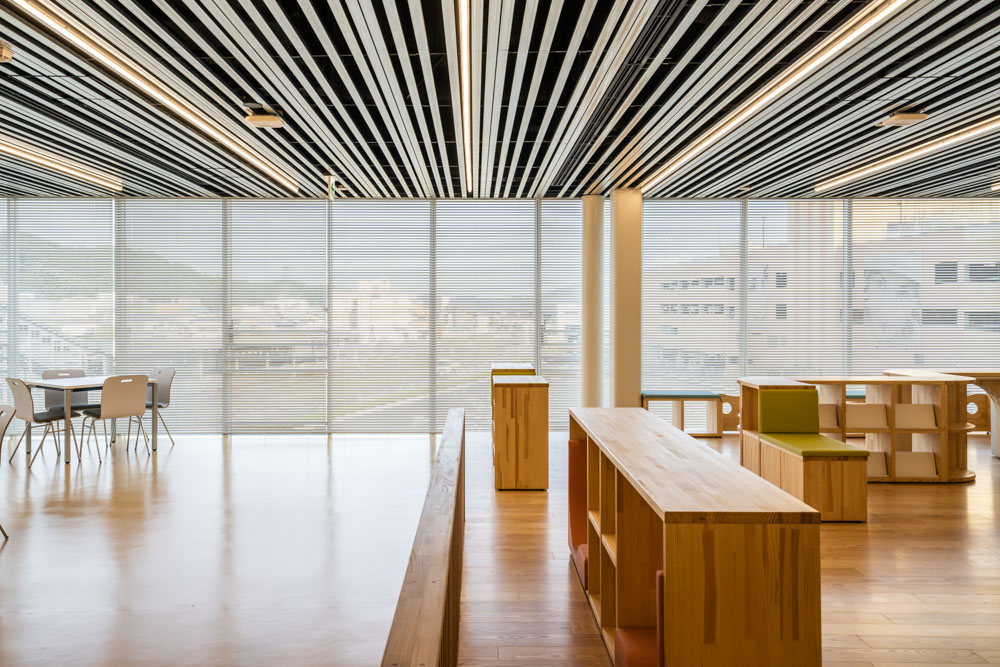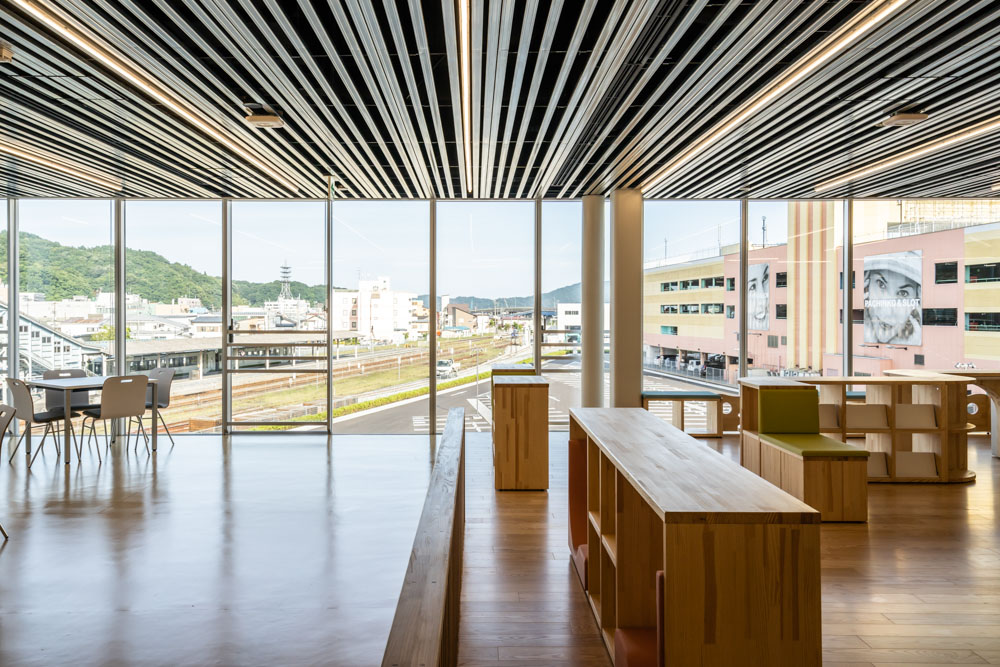 市民の利用が多い共有スペースの、おおきな開口部いっぱいにアルミブラインドを取り付けています。スラットの調整で、外光をふんだんにとりいれたり、調整したりできます。窓外に見える宮古駅が借景になっている、市民のいこいのスペースです。