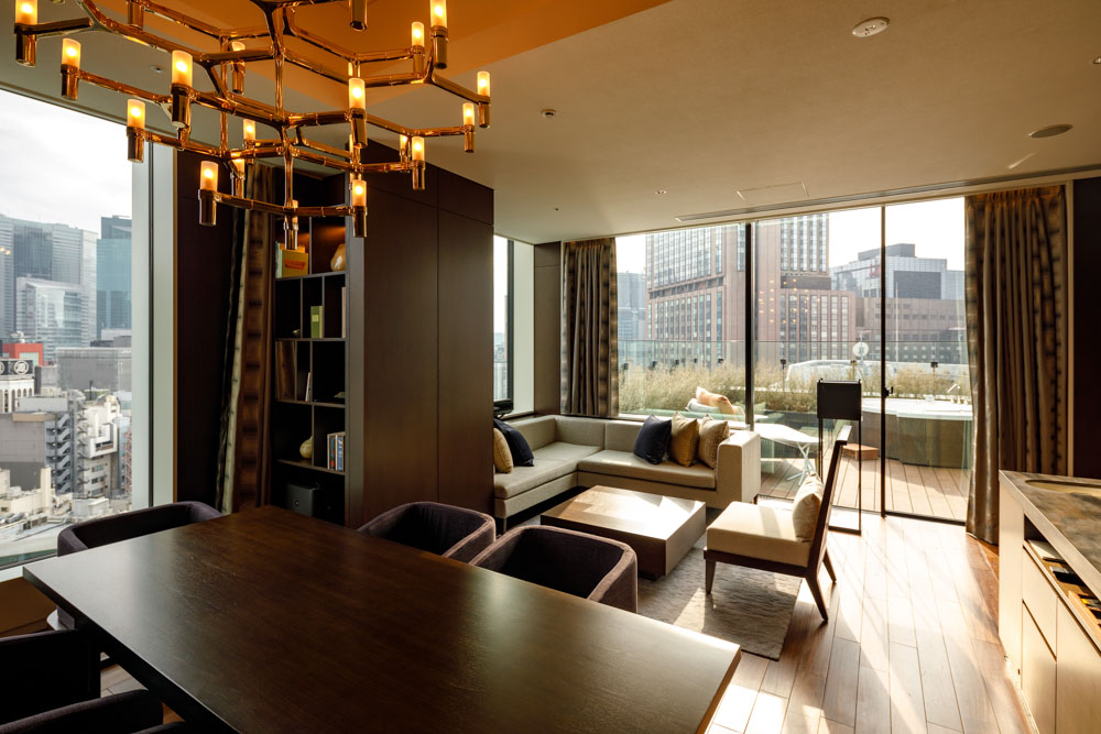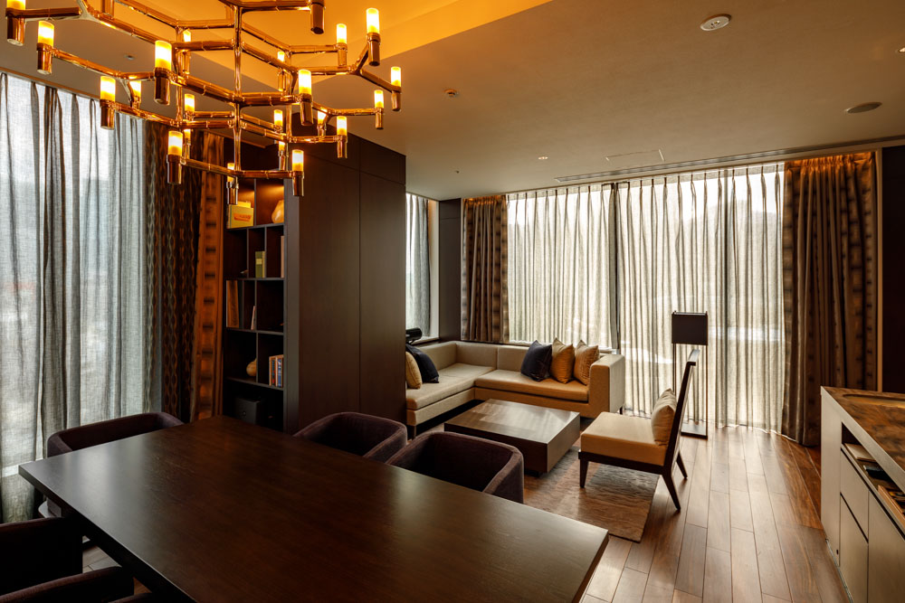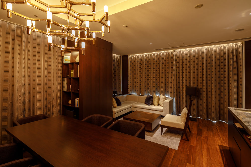 バーエリアの窓には、手動タイプのローマンシェードを設置。ロビーから続く空間のため、電動と合わせてシャープタイプで、一体感を持たせます。家具や造り付けの縦のラインと、シャープタイプの横のラインが同じく活かされ、気持ちのいいコーディネートになっています。