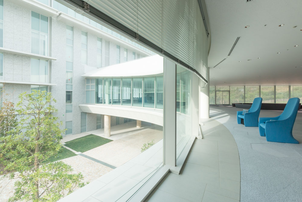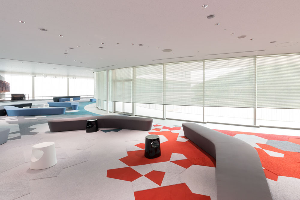 研修施設の広いホワイエです。緩やかに描くカーブの窓の全てに、スラット幅35㎜の電動ブラインドを施工しています。遮熱スラットのカラーバリエーションも多く、機能性だけでなく、空間になじむコーディネートも可能です。