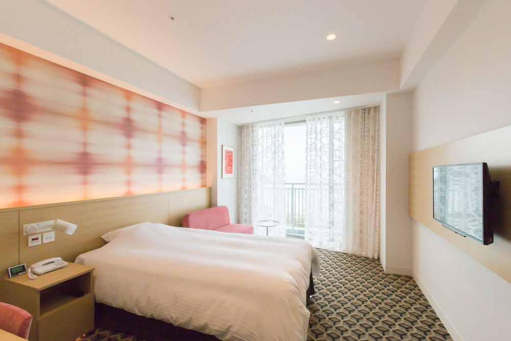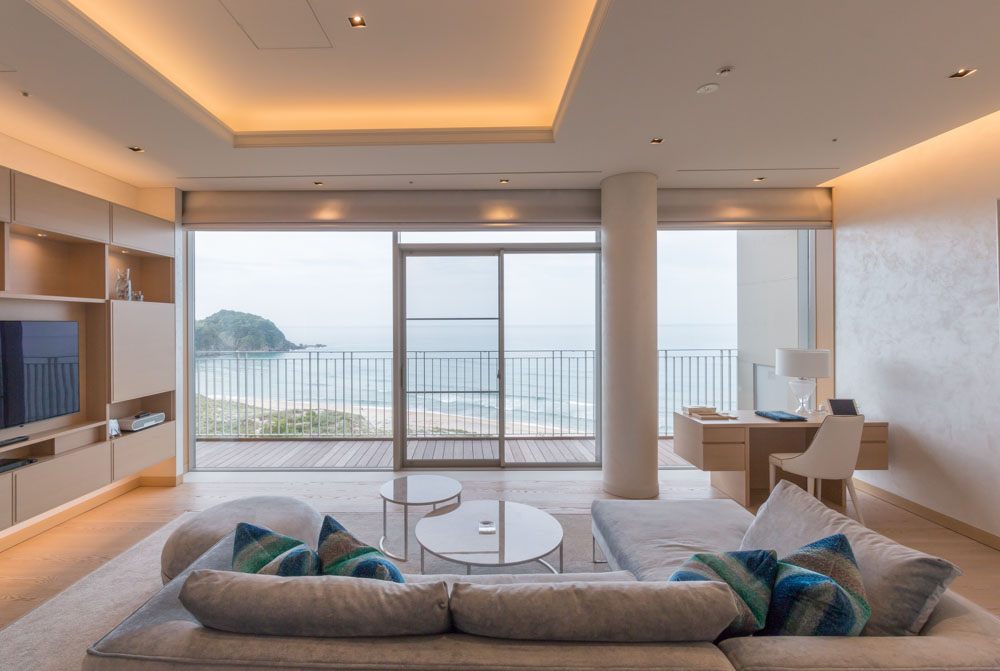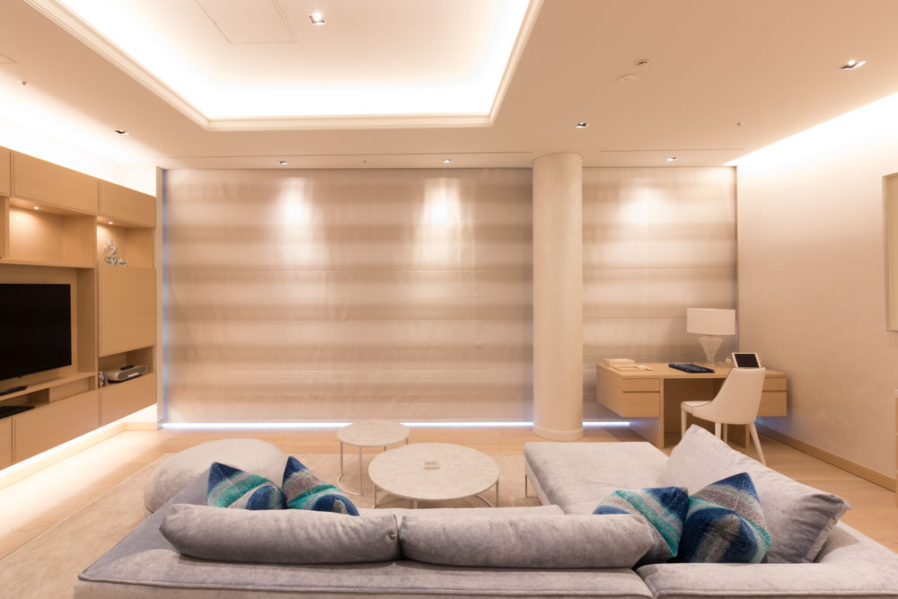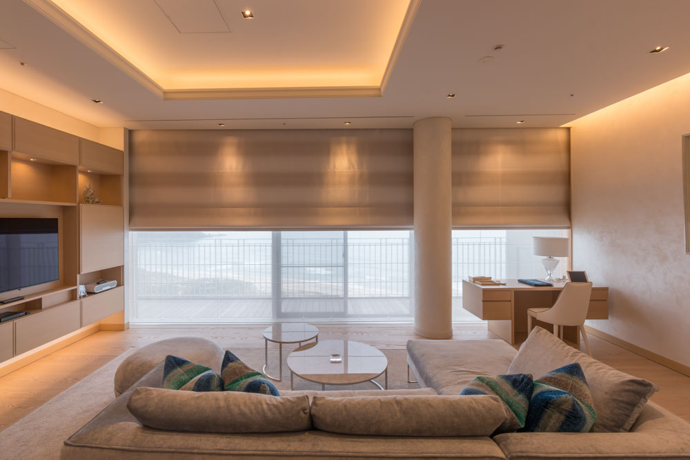 海を臨むVIP用宿泊室の大きな窓を、1台の電動ローマンシェードですっきりと収めた事例です。スーパーリベルタは、最大製作幅8mまで対応可能です。ドレープ、レース用に2台設置して、1ランク上の空間を演出しています。