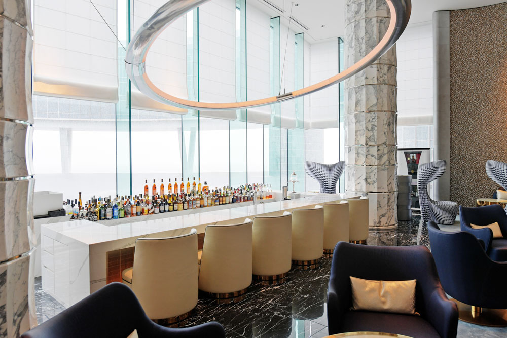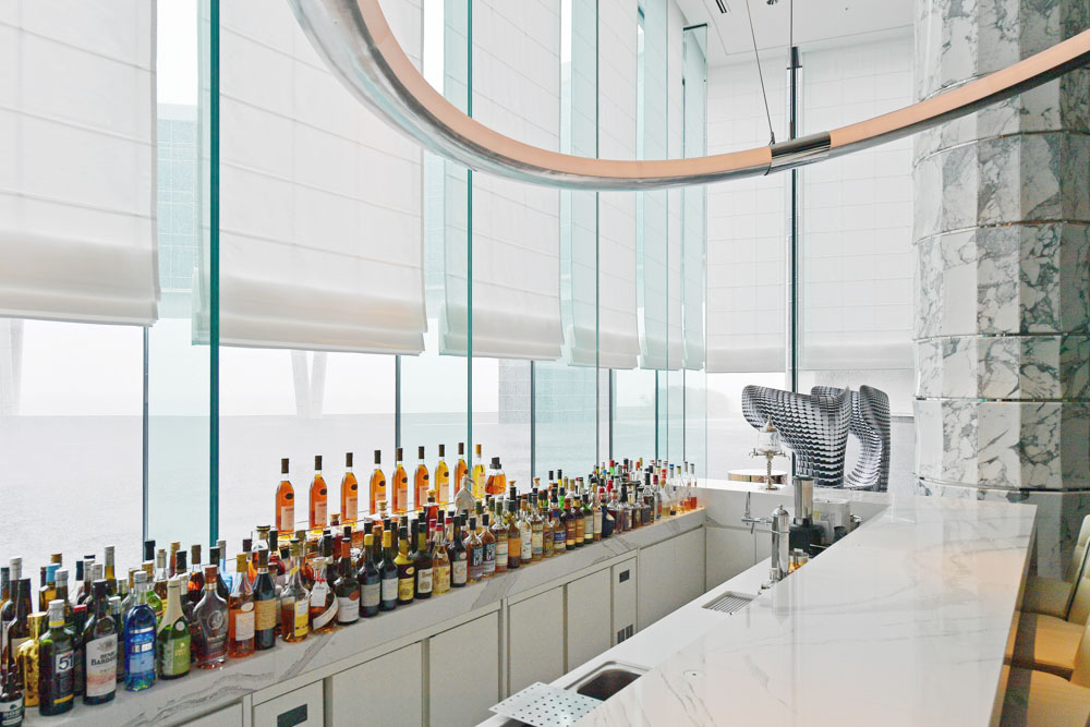 エントランスから続くエレベーターホールにも、同じ静音性の高い電動ローマンシェードを施工しています。ゾーンを設定してエリアごとの昇降が可能なため、このような連続する窓に最適の製品です。