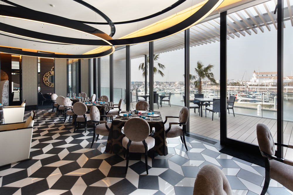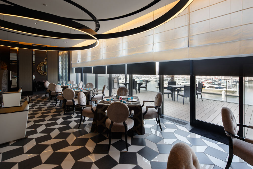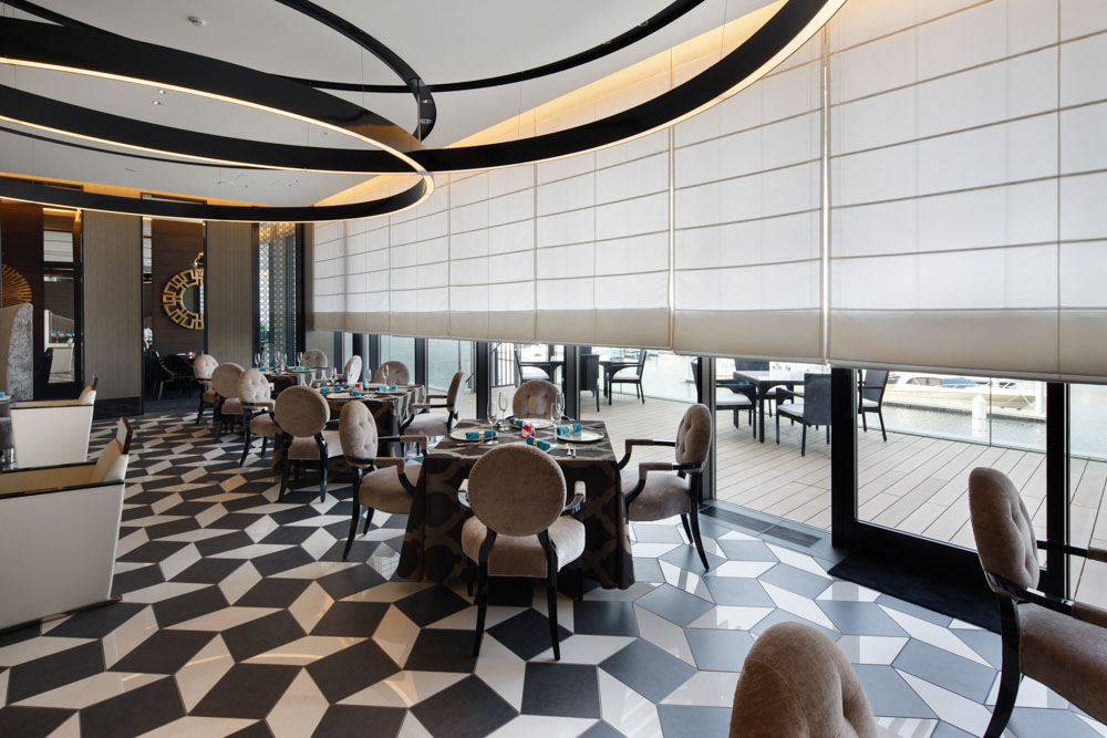 会員制リゾートホテルのレストランです。緩やかに弧を描いた窓面に沿って、電動ローマンシェードを収めています。全開時には、窓外のハーバーの眺望を楽しみ、シェードを降ろした際には、曲線をモチーフにしたインテリアデザインにうまくコーディネートされ、上質な空間となっています。
